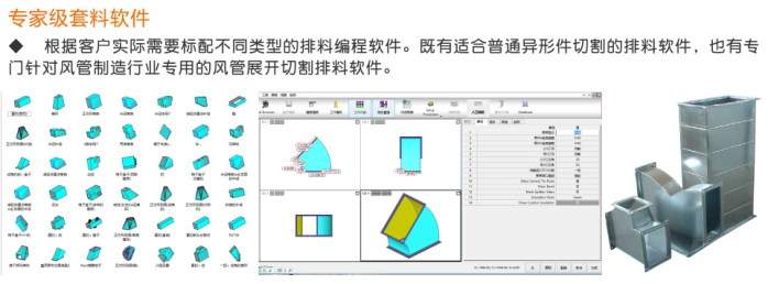 3.對(duì)于鈑金或風(fēng)管展開切割用戶:本設(shè)備可與金林鈑金、CAM-DUCT、Lantek等風(fēng)管行業(yè)專用軟件實(shí)現(xiàn)無縫對(duì)接,用戶只需在軟件中選擇鈑金件樣式、輸入簡單的參數(shù),即可自動(dòng)生成展開件、自動(dòng)排料、自動(dòng)生成切割程序,然后調(diào)入到數(shù)控切割機(jī)中進(jìn)行切割加工,使鈑金切割工作更便捷、更高效。